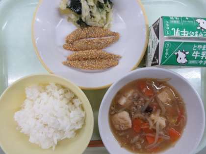 今日の献立は、ご飯、牛乳、きびなごのさくさく揚げ、海藻サラダ、厚揚げの中華煮込み です。