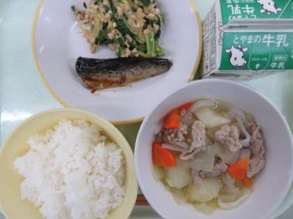 今日の献立は、ご飯、牛乳、いわしの土佐煮、納豆和え、塩肉じゃが です。当初、予定されていた「あいか」は、生育不良による出荷減少のため、本日の提供は中止となりました。残念です。