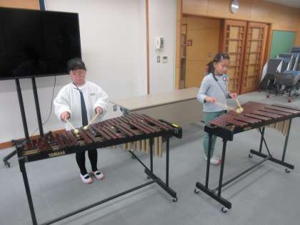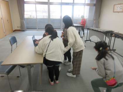 「茶色の小びん」の合奏練習をしました。それぞれのパートの音を聴き合いながら演奏しています。
