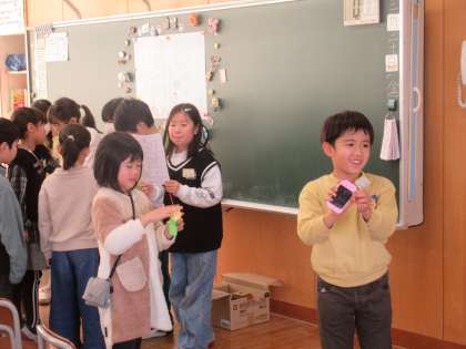 画像は、くじ引きの様子です。くじを引くと、「凶」「大吉」等の運勢が書かれていて、好きな折り紙作品がもらえます。