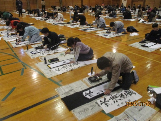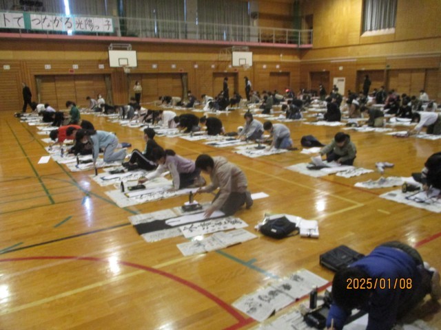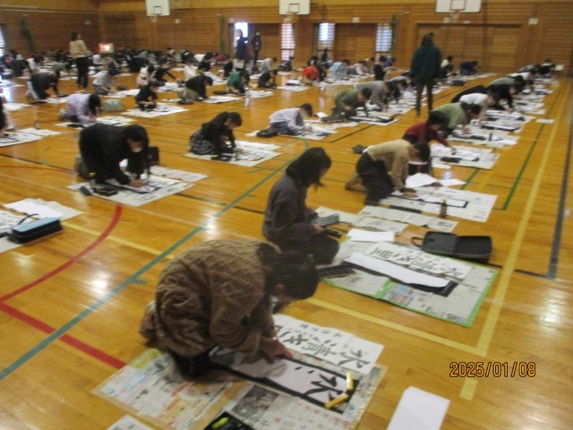 書初大会では、子供たちが一筆一筆に気持ちを込めながら冬休みの練習の成果を発揮する