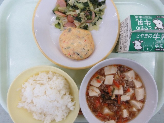 今日の献立は、ご飯、牛乳、かにたま、チンゲンサイソテー、マーボーどうふ です。