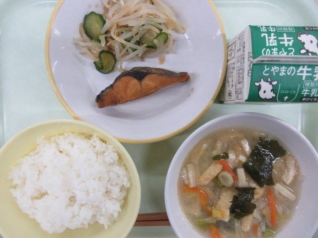 今日の献立は、ご飯、牛乳、あじのかば焼き、もやしのおひたし、高野豆腐のみそ汁 です。