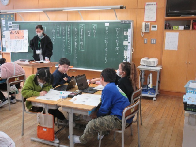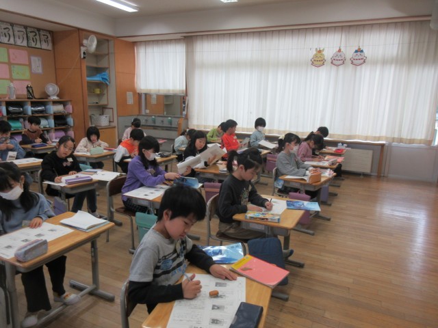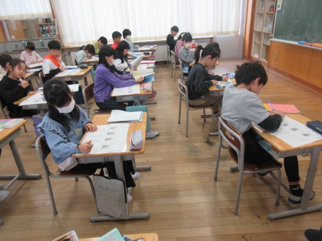 1組と2組は、国語科の学習で、4枚の絵を手がかりにお話づくりをしていました。