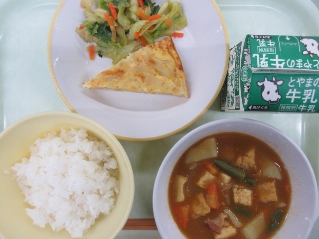 今日の献立は、ご飯、牛乳、スパニッシュオムレツ、黄金比の野菜炒め、厚揚げのカレー味 です。