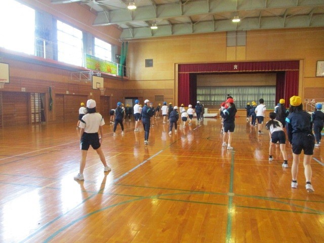 体育では、跳び箱の学習が始まりました。今日は、ウォーミングアップです!