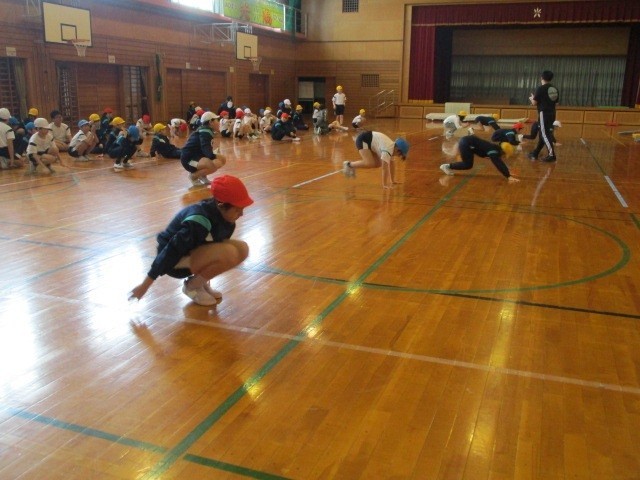 馬跳びやうさぎ跳びをして、基本的な動きを覚えていきます。