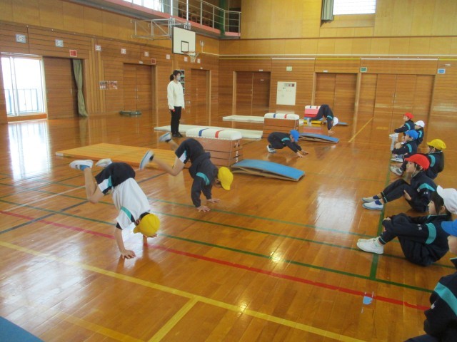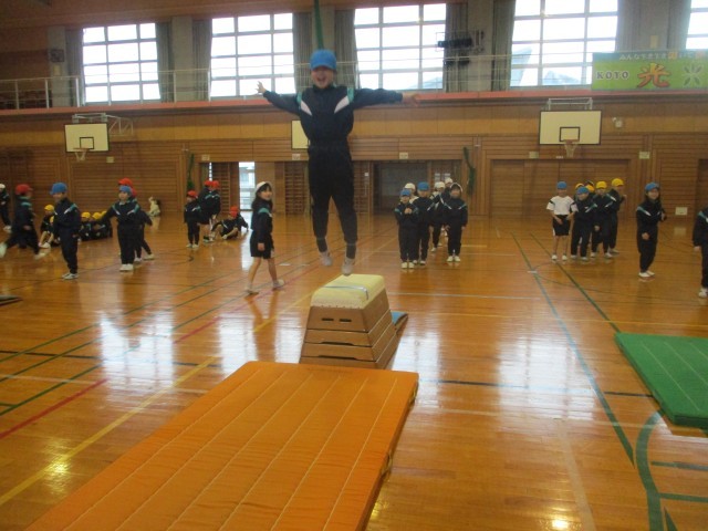 かえるとびや馬跳びの練習をしたり、とびばこの上から高くジャンプする練習をしたりしました。跳び箱の基礎となる大切な動きを、楽しみながら学習できました。
