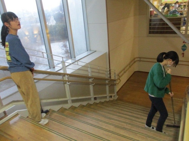 登校後に全校が使う階段を掃除しています。高学年として、委員会の仕事に責任をもって取り組んでいますね。