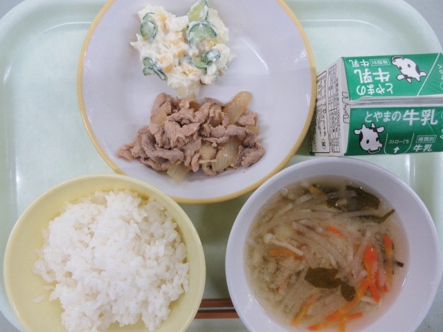 今日の献立は、ご飯、牛乳、豚肉の生姜焼き、ポテトサラダ、みそ汁 です。