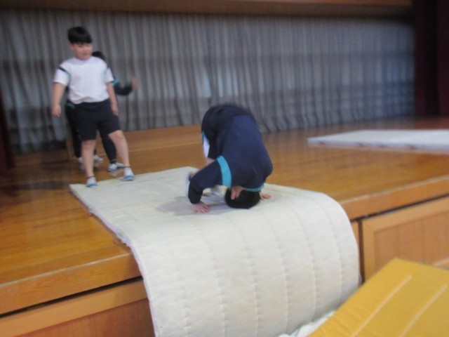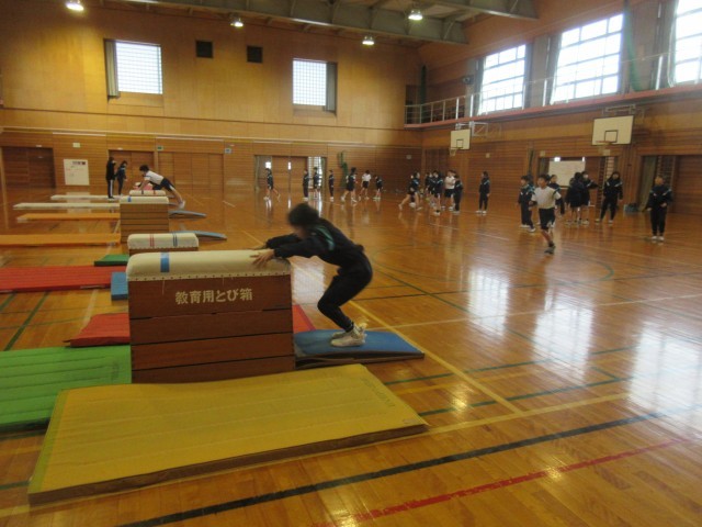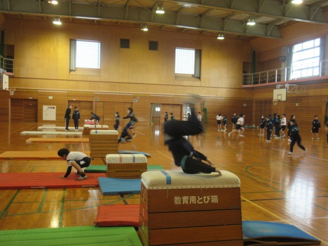 中学年では、低学年で身に付けてきた動きと運動感覚をもとに、台上前転や閉脚跳び等の基本的な支持跳び越し技に挑戦しています。