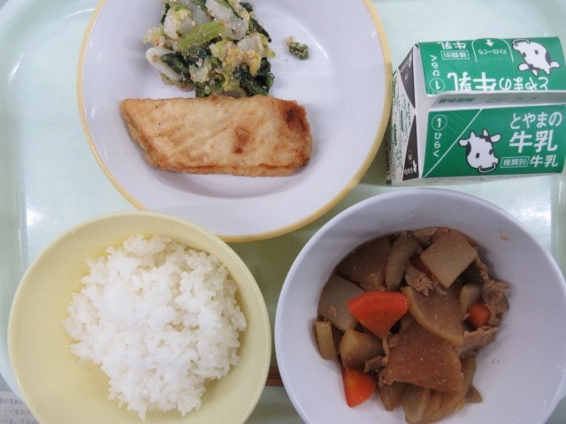 今日の献立は、ご飯、牛乳、煮みそ、ホキの天ぷら、青菜のごま和え です。
