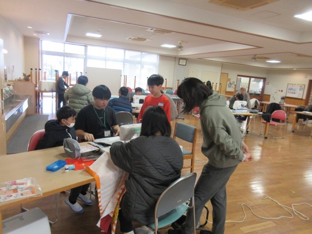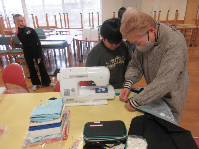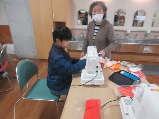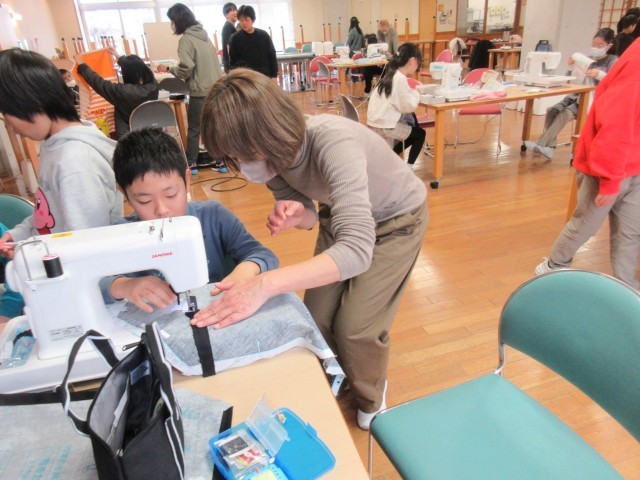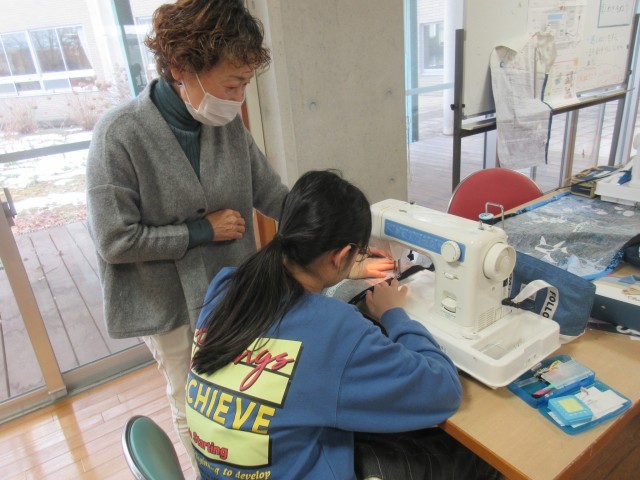 ミシンでエプロンづくりをするにあたり、地域の方が一緒に指導してくださいました。
