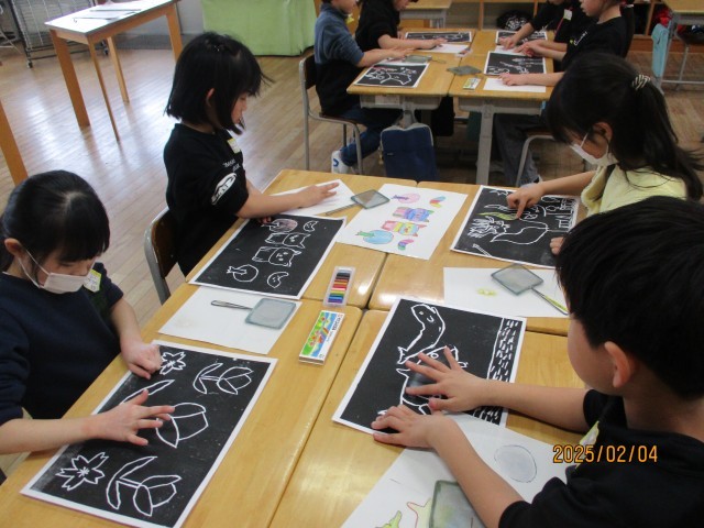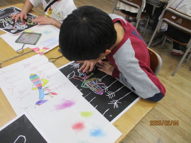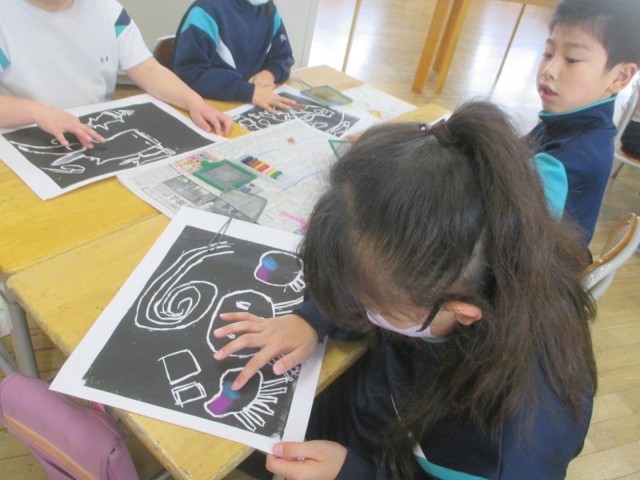 想像を広げながら色を付けました。指でくるくると色を混ぜたり、なじませたりと楽しみながら活動しています。