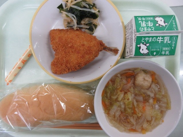 今日の献立は、コッペパン、牛乳、あじフライ、大根サラダ、春雨スープ、ぼうチーズ です。