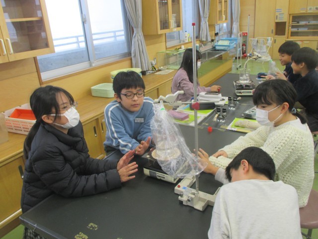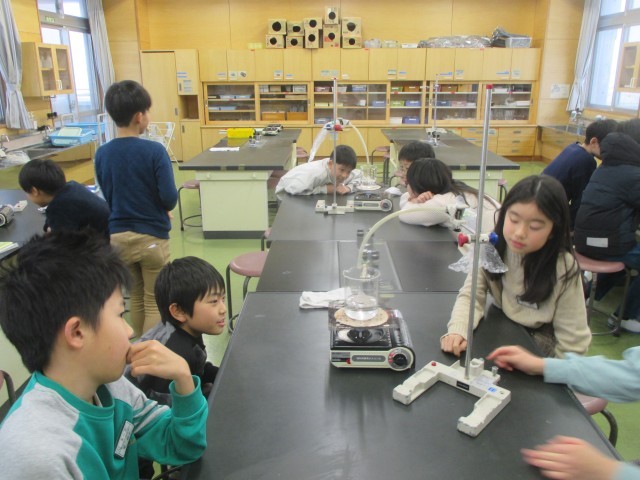理科では、「水のすがたと温度」の学習をしています。水を熱したときに出てくる湯気やあわの正体について、実験を通して調べました。