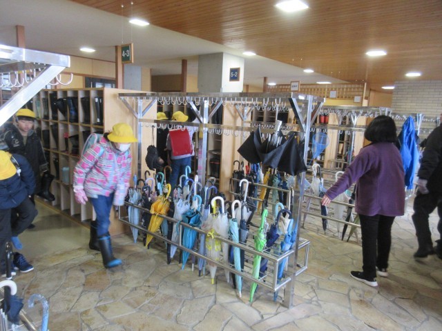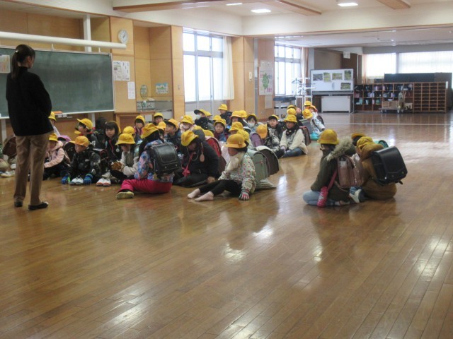 それぞれの学年で、色コースごとに分かれて待機し、放送に従って順に玄関を出ました。