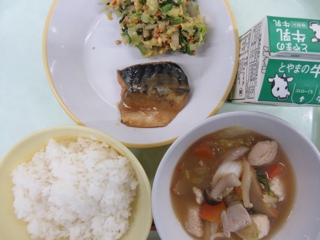 今日の献立は、ご飯、牛乳、さばの味噌煮、炒り大豆和え、ちゃんこ鍋 です。