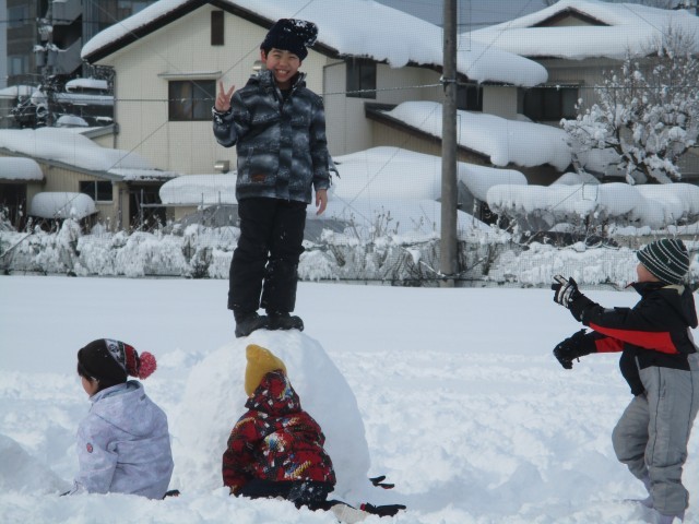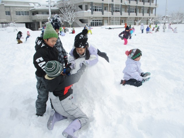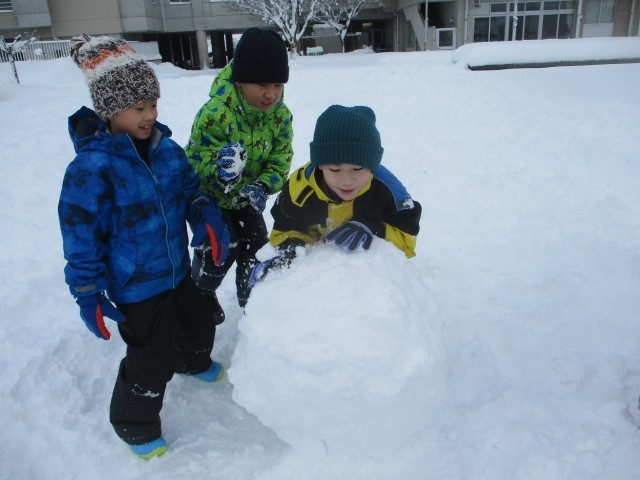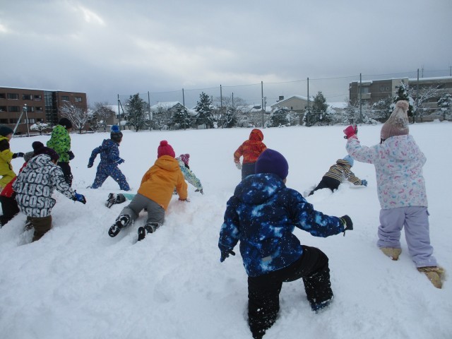 ふわふわの雪が積もったグラウンドで、雪遊びをしました。雪の中をかけっこしたり、団ごとに雪玉の大きさ対決をしたりしました。自由遊びでは、友達と雪合戦をしたり、雪だるまを作ったりして楽しみました。