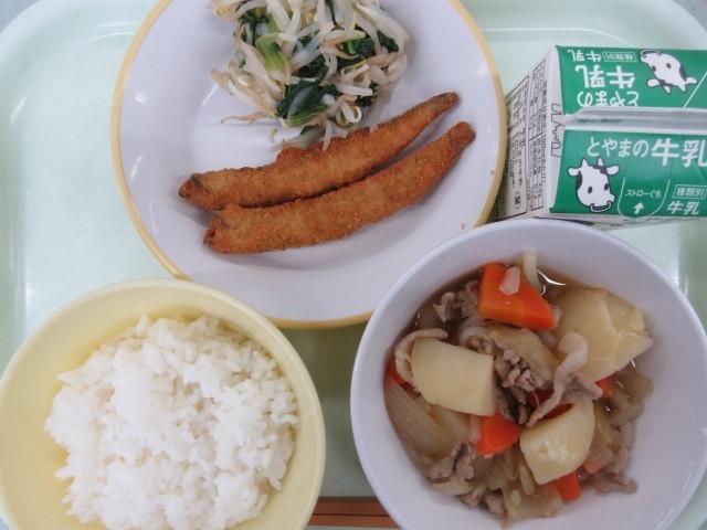 今日の献立は、ご飯、牛乳、ししゃもフライ、しょうがひたし、肉じゃが です。