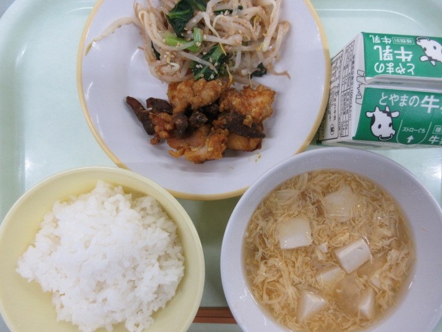 今日の献立は、ご飯、牛乳、鶏肉とレバーのカレー風味、ナムル、かきたま汁 です。