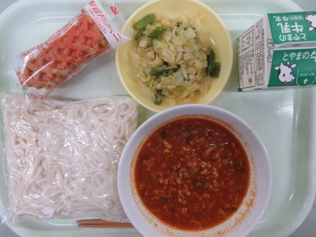 今日の献立は、ソフト麺、ソフト麺のミートソースかけ、チーズドック、アスパラサラダ です。