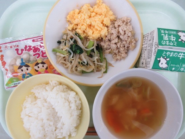 今日の献立は、二食丼(ご飯、とりそぼろ、炒り卵)、菜花ひたし、白玉汁、牛乳、ひなあられ です。