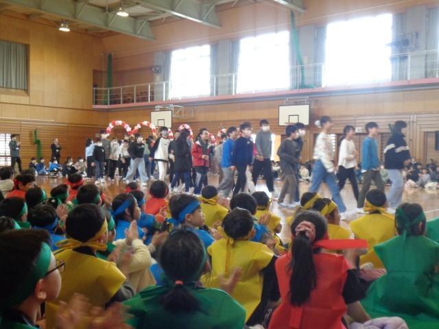 4日(火)に卒業お祝い集会がありました。入場してくる6年生を見つめ、「感謝の気持ちを伝えるぞ」という思いを高め、本番を迎えました。「6年生応援団」として、元気いっぱいの演技で、6年生にエールを届けることができました。その後のプログラムも楽しみ、6年生との楽しい思い出がまた一つ増えました。