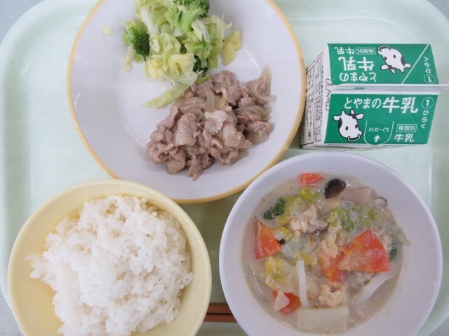 今日の献立は、ご飯、牛乳、豚肉の塩麹炒め、そえ野菜、ごま豆乳鍋 です。