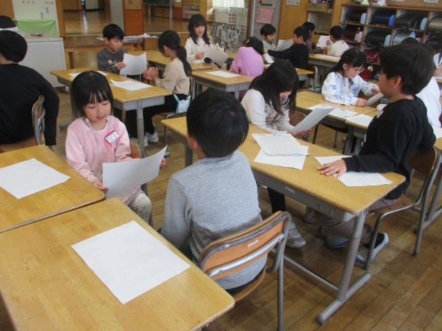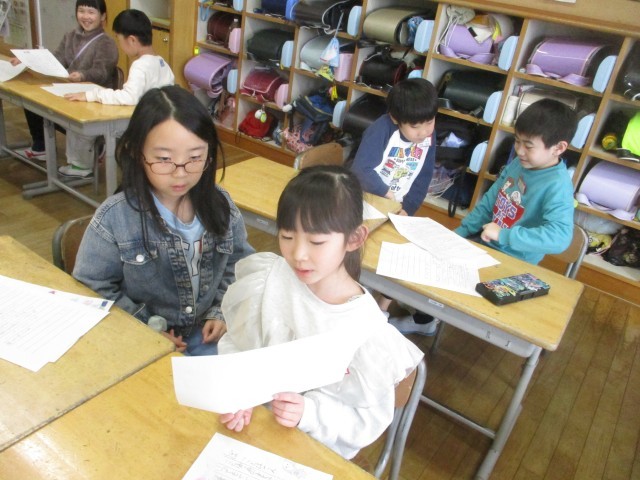 国語の学習で、友達のすてきなところを手紙に書きました。2年間、一緒に過ごしてきたので、子供たちは、お互いのすてきなところをたくさん見付けることができました。心のこもった手紙をもらって、みんなとても嬉しそうでした。