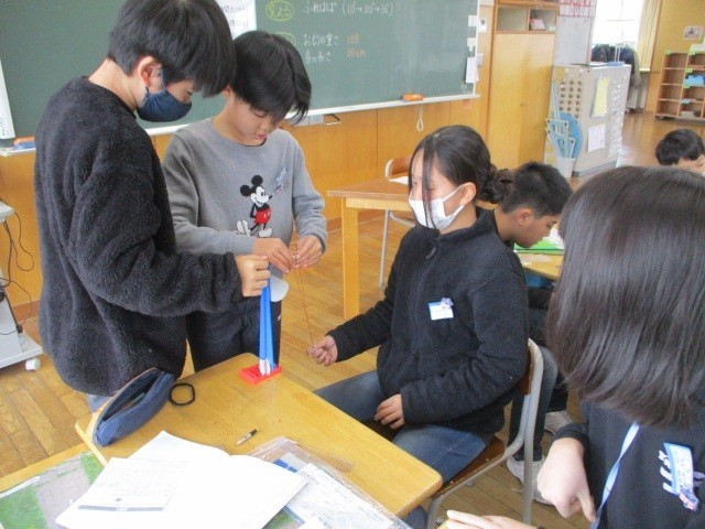 理科の学習では、ふりこが1往復する時間は何よって変わるのかを調べています。グループで役割分担をして、実験に取り組んでいます。