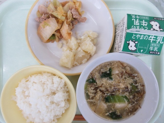 今日の献立は、ご飯、牛乳、豚肉のキムチ炒め、こふきいも、卵ともずくのスープ です。