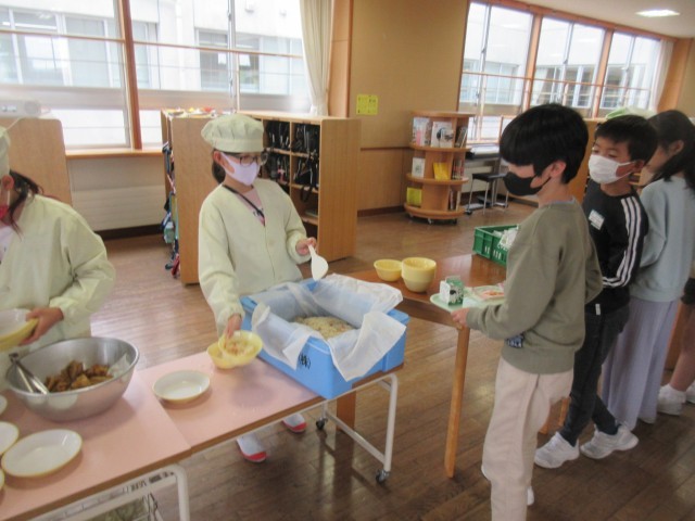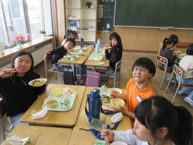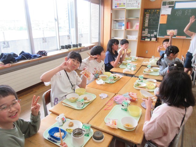 今日の給食は、「入学祝い献立」でした。「クレープのクリームとジャムの組合せが絶妙だった」「今日の献立、最高だった」と大満足の子供たちでした。