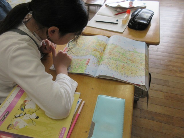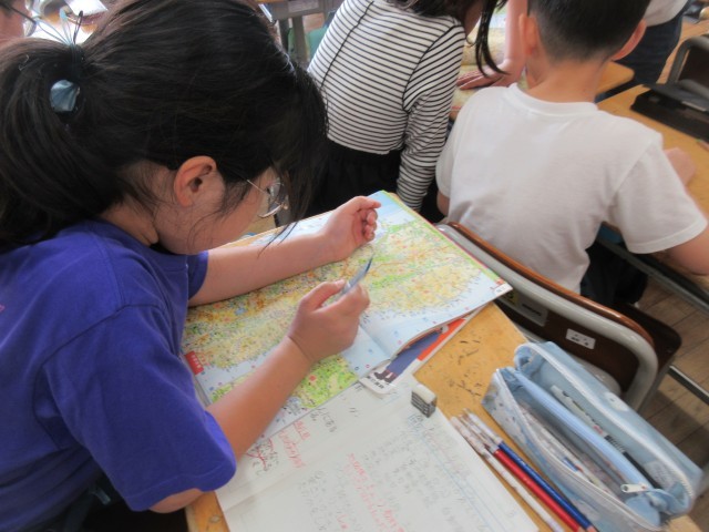 地図帳の使い方を学習しました。地図には、特産物や名所、土地の高さ等、色々な情報がかかれていることが分かりました。