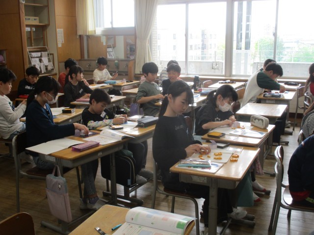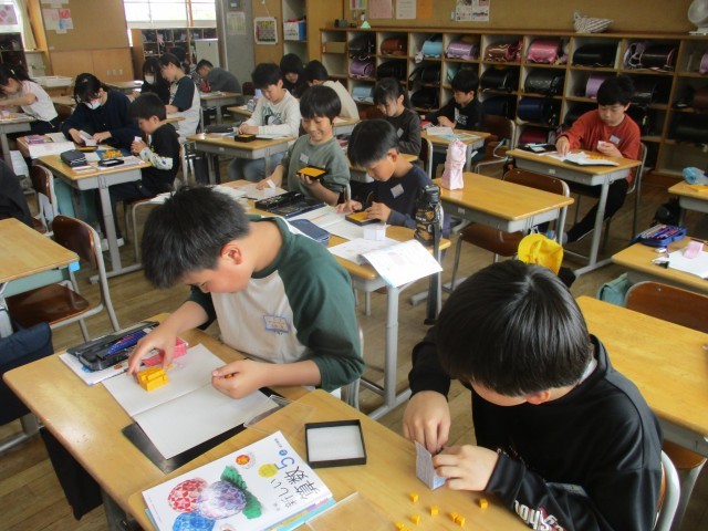 算数では体積の学習をしています。まず、大きさの異なる箱のかさを比べるために、1辺が1㎝の立方体を敷き詰めて調べました。