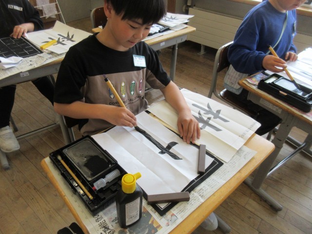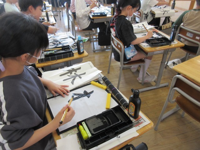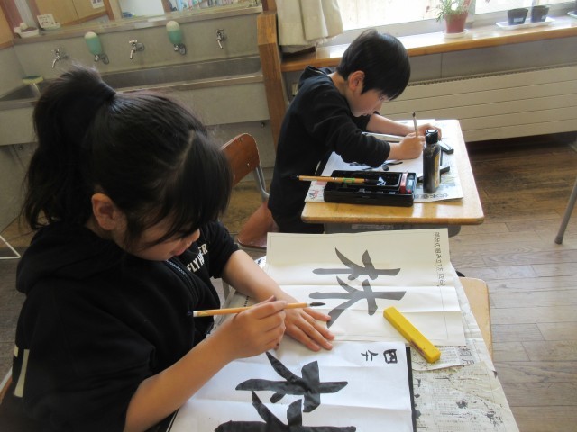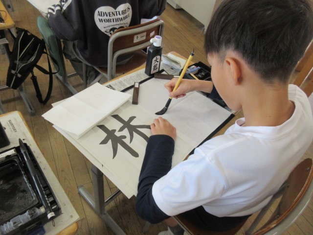 「木」と「木へん」の違いについて話し合ったことを意識して、「林」を丁寧に揮毫しました。