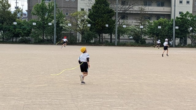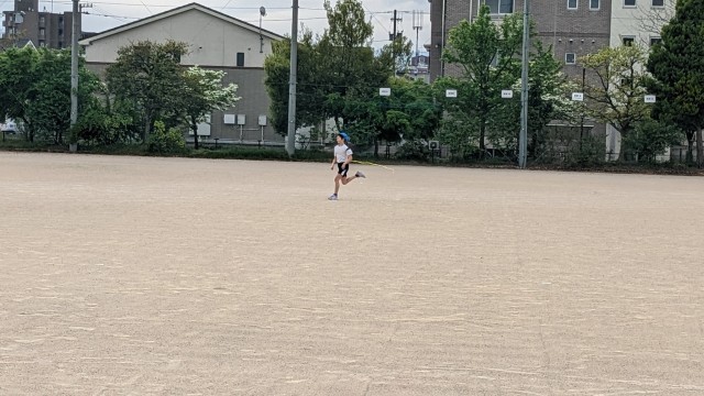 50m 走で腰にタフロンテープをつけて走りました。勢いよく走るとよくタフロンテープがなびいていました。