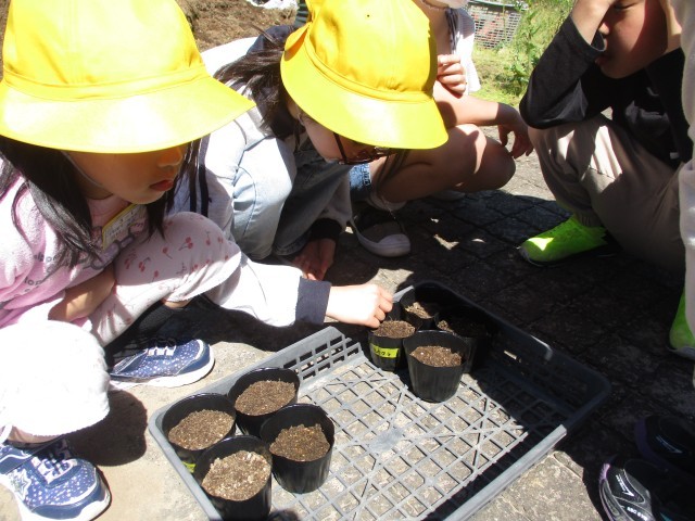 ホウセンカ・ひまわり・オクラ・ピーマンの4つの種を班で協力しながら、植えました。