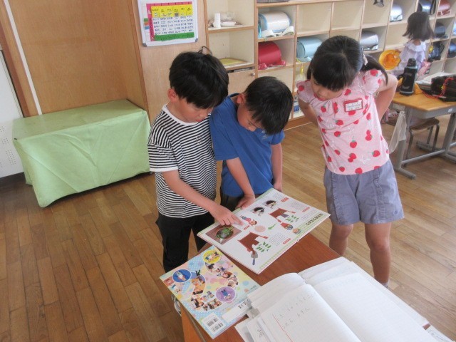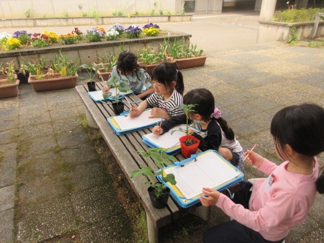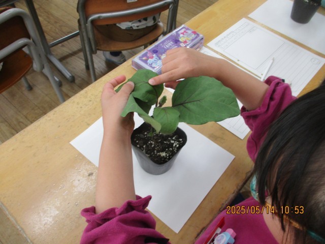 生活科の学習で、野菜を育てます。苗が届いたので、じっくりと茎や葉を観察しました。気になることを調べたり名前をつけたりして、すでに愛情いっぱいの子供達です。