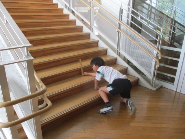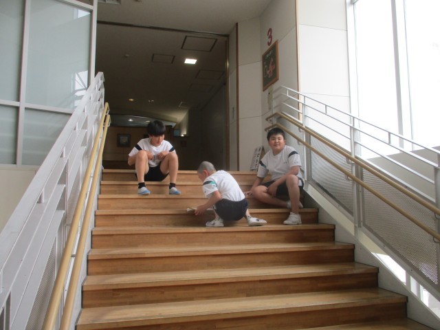 算数では比例の学習を行っています。光陽小学校の階段1段分の長さを求め、比例の関係を使い1階から3階までの高さを計算で求めました。