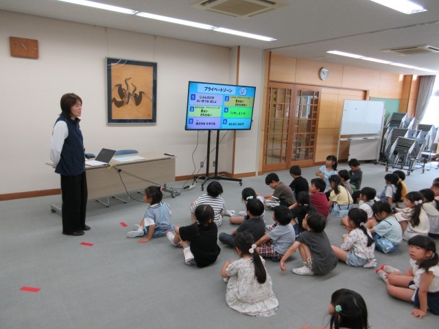 外部講師の方を招いて「くもくん教室」を行いました。水泳の学習を迎えるにあたって、水着に着替えることを踏まえ、プライーベートゾーンを守るために大切なことを考えました。