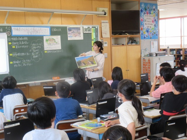 「あたたかい土地のくらし」の学習をしています。沖縄の雨温図や地形図等の資料から気付いたことや気になったことを出し合いました。