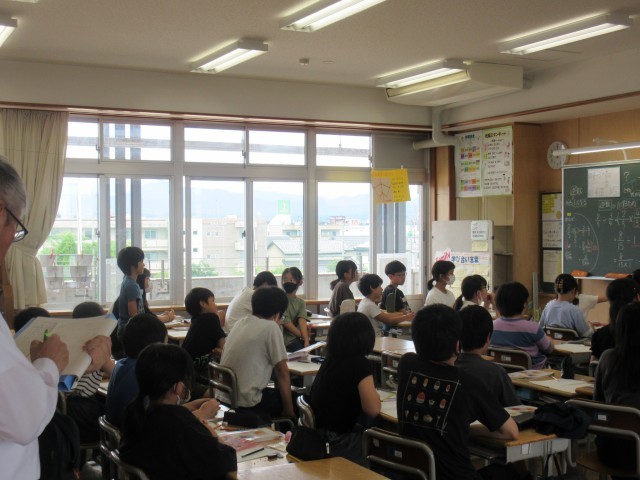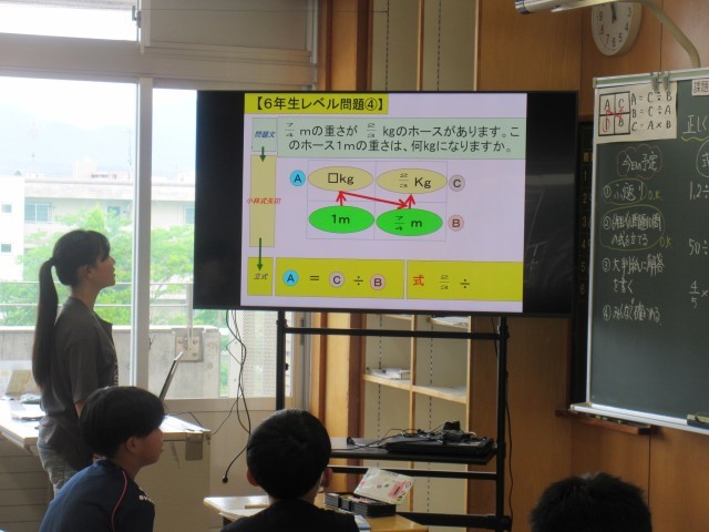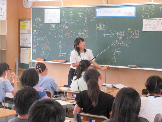 分数÷分数の計算の仕方を考えています。自分の考えを分かりやすく説明する力がついてきています。