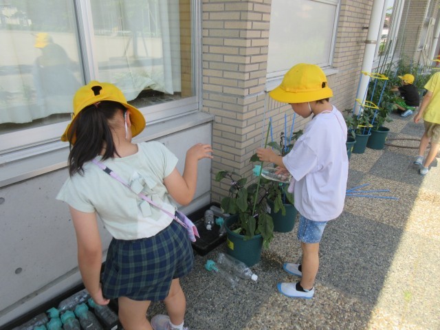 下校の前に、自分の野菜の健康観察をしている子供たち。実がなり始めた子供もたくさんいました。