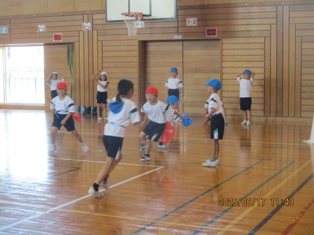 体育の学習では、タグ鬼ごっこをしています。団のメンバーと作戦を立てて、どうしたらより多くのタグをとることができるかを考えています。