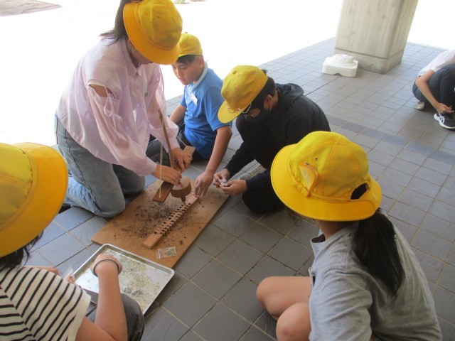 先日、校外学習に行ってきました。埋蔵文化財センターでは、昔の人々のくらしについて学びました。まがたまづくりや火起こし体験もしました。