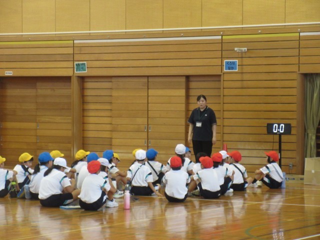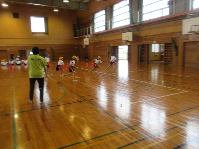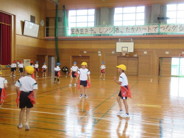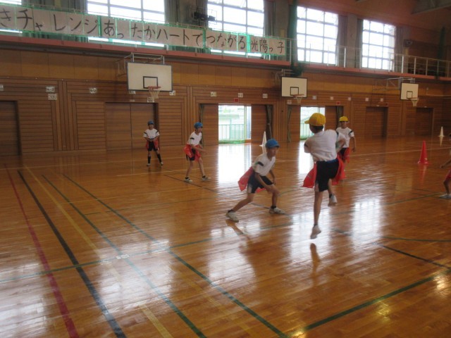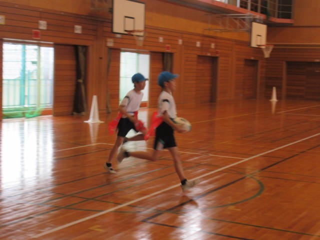 ゴール型ゲームの学習をしています。チームで作戦を考えて、協力してプレーしていました。