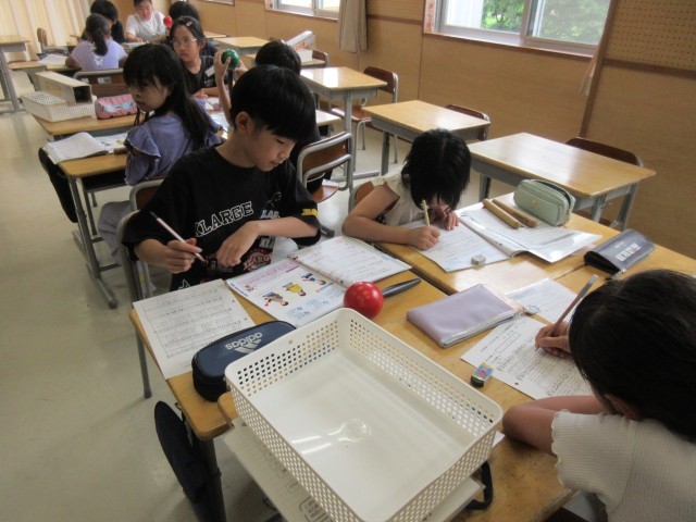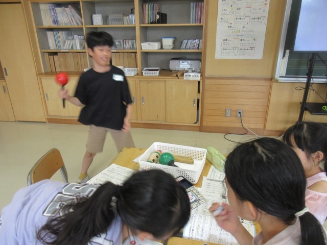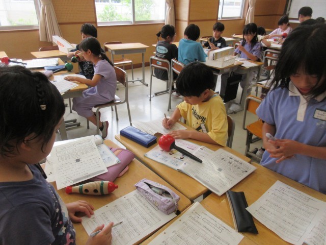 楽曲「いろんな木の実」で、マラカスやギロ、クラベス等の楽器に挑戦しています。グループに分かれて担当を決め、どの部分でどの楽器を演奏するかを楽譜に書き込んでいました。