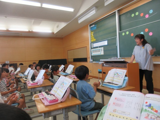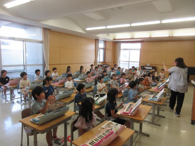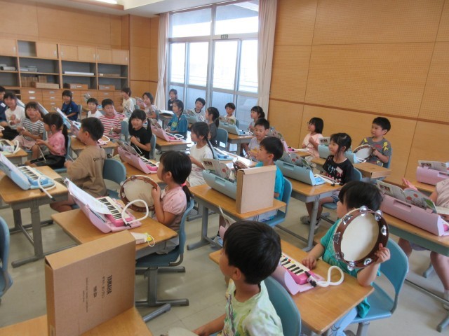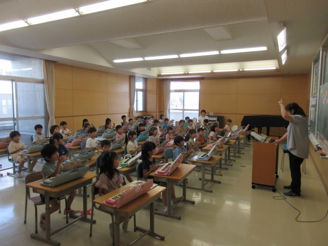 先生の鳴らすリズムをまねっこしました。子供たちは、先生のリズムをよく聴いて、すずやタンブリンを楽しそうに鳴らしていました。