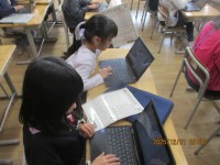 ローマ字表を見ながら、タイピング練習する子供たちの様子です。自分の名前はもちろん...